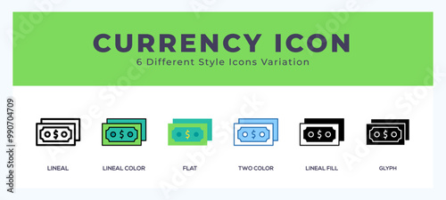 Currency icon set with different styles. Design elements for logo. Vector illustration.