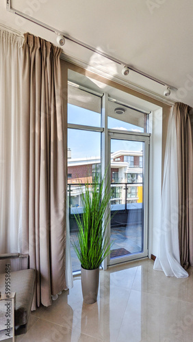 Curtains on full height windows in the interior of the house. Curtain rods installed in the ceiling at an angle to the horizon. Cornices with beige drapes and white tulles. Interior details close-up.