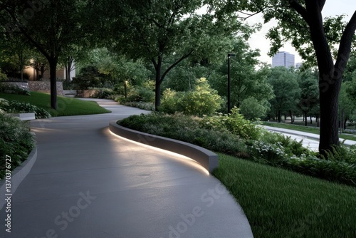 park, pathway, green, tree, landscape, garden, nature, paseo, path, scenery, illumination, light, ambient, flora, summer, daylight, blooming, floral, leaf, grass, tranquil, peaceful, serene, botanical, environment, ecology, exterior, beauty, vibrant, fresh, natural, space, stone, cement, curve, art, design, view, urban, structure, modern, texture, background, residential, architecture, growth, season