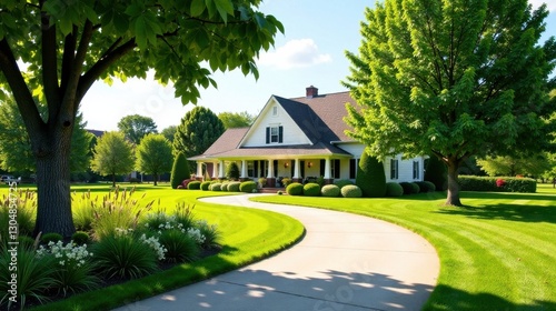 Curving Driveway Leading to a Charming Suburban House with Lush Green Landscaping and Mature Trees Under a Sunny Sky