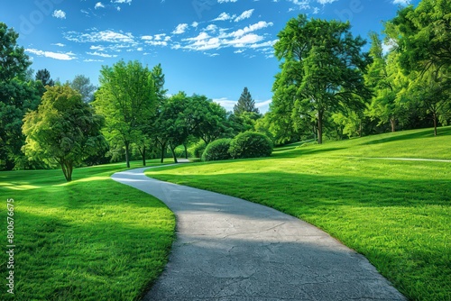 curving pathway in a park, vibrant green grass on either side, rows of lush trees, clear blue sky with scattered clouds above