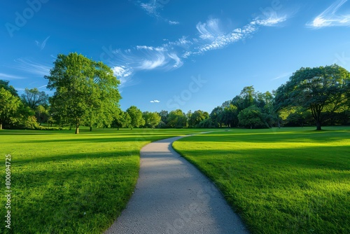 curving, pathway, park, vibrant, green, grass, row, lush, tree, clear, blue, sky, scattered, cloud, up high, nature, outdoors, landscape, scenery, tranquil, peaceful, serene, picturesque, beauty, idylli, scenic, sunny, sunlight, bright, foliage, vegetation, paseo, summer, day, exploration, calmness, peacefulness, atmosphere, ambience
