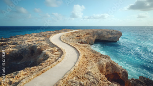 Curving stone path traverses rugged cliffs by the sea meeting blue waves Sky above calm Peaceful scenic and sunny