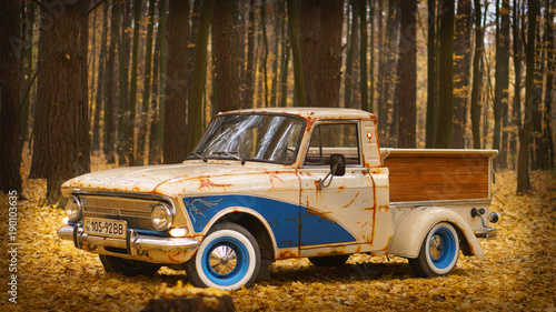 Custom truck creative idea with blue color artificial rust and wooden luggage retro cars in a fall forest