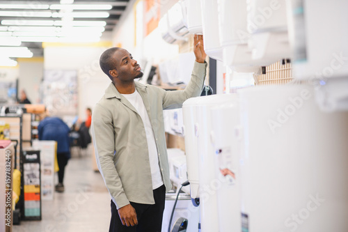 african, american, electronic, appliance, store, client, shopping, man, choosing, water, heater, boiler, electric, home, retail, consumer, purchase, buying, shop, commerce, product, sale, marketing, business, decision, selection, variety, option, display, showroom, air, conditioner, conditioning, new, modern, technology, lifestyle, male, black, person, indoor, interior, supermarket, hypermarket, mall, department, selecting, looking, comparing