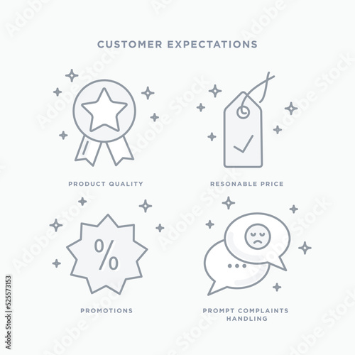 Customer Expectations Icon Set. Minimalist Line Icons: Product Quality, Good Price, Promotions, Customer Claims Handling - Editable Stroke, Smart Stroke, Vector Icons.
