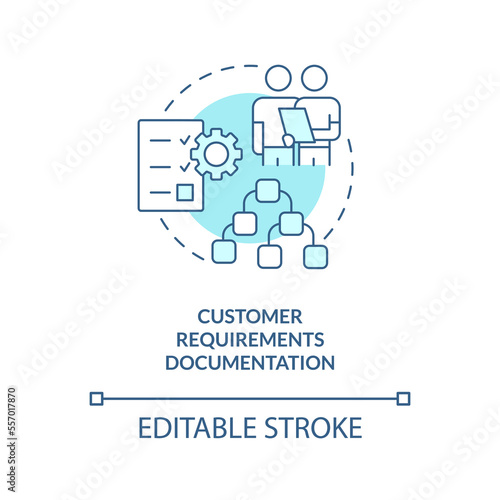 Customer requirements documentation turquoise concept icon. Project planning benefit abstract idea thin line illustration. Isolated outline drawing. Editable stroke. Arial, Myriad Pro-Bold fonts used