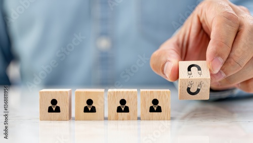 Customer retention concept. Inbound marketing strategy. Attracting potential customers. Hand puts wooden cubes with magnet attracts customer icons on beautiful grey background and copy space. Loyalty
