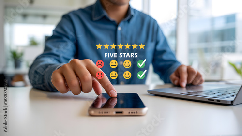 Customer Review on Smartphone: A person interacting with a smartphone displaying a five-star review, with smiley face indicating a good experience and a concept of satisfaction and feedback.