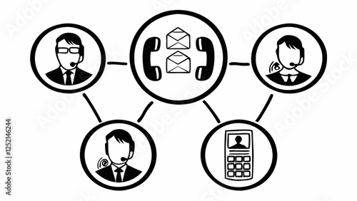 customer service, communication, support, network, diagram, phone, electronic mail, headset, agent, employee, business, technology, corporate, efficiency, teamwork, customer support, help desk, call center, assistance, icon, graphic, black-and-white, illustration, vector, modern, simple, service, help, contact, interactive, solution, interconnected