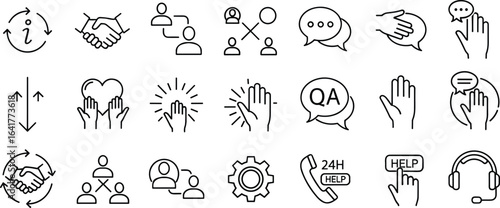 Customer support icons, communication symbols, help desk graphics, quality assurance, handshake, chat bubbles, high five, 24H assistance, gear, call center