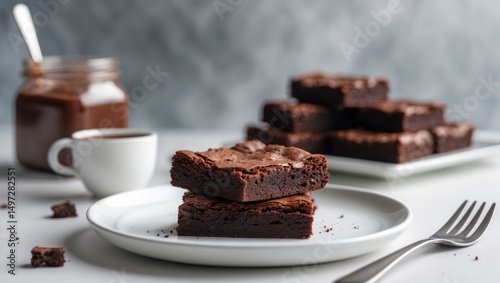 Cut brownies on a white plate set against a background. Served alongside fudge in a jar. A cherished dessert for chocolate lovers. Cocoa flavor that is sweet and moist.