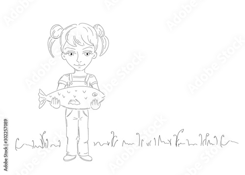 girl, children, fishing, showing, fish, leisure, nature, sport, presenting, cute, illustration, black-and-white, drawing, cartoon, woman, vignetting, white, silhouette, art, design, big fish