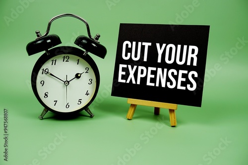 Cut Your Expenses text message on paper card with alarm clcok on wooden background