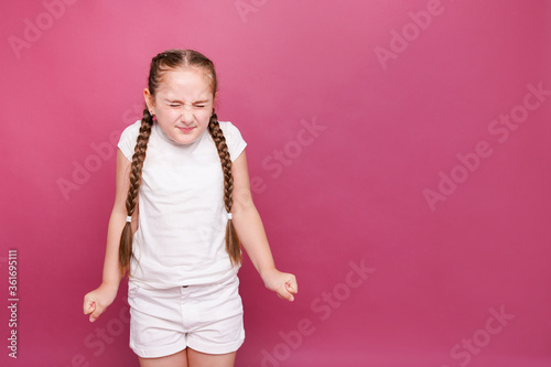 Cute 7-8 years old girl frowns with closed eyes on pink background