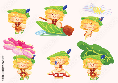 adventure, elf, fantasy, cartoon, illustration, cute, fairy tale, fairy, tale, nature, children, character, children, vector, green, magic, art, background, costume, timberland, forest, garden, little, small, mystery, design, bungalow, girl