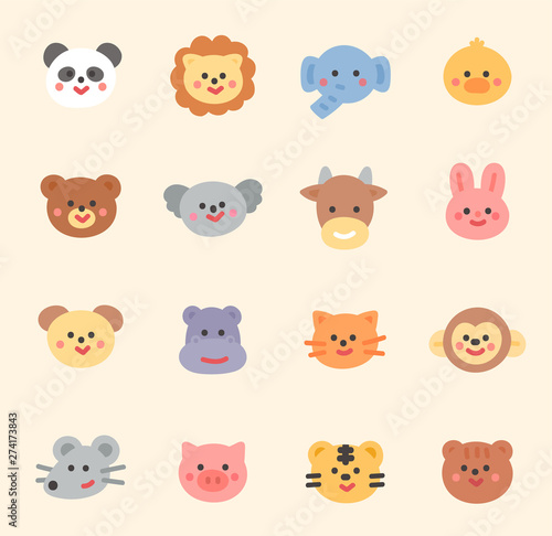 animal, face, cute, character, smile, happy, fun, baby, children, panda, lion, elephant, duck, bear, koala, cow, rabbit, dog, hippo, cat, monkey, mouse, pig, tiger, education, icon, circle, vector, flat, set, group, collection, isolated, bundle, colourful, illustration, minimal, simple, cartoon, clip art, graphic, design, illustrator