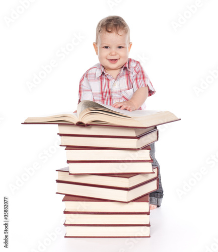 cute baby boy with many books isolated on white