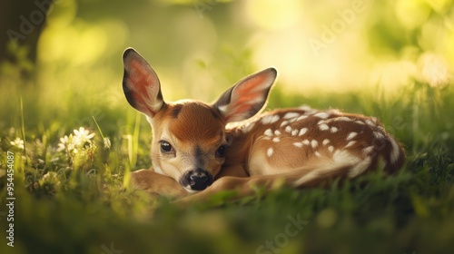 Cute Baby Deer Fawn Resting in Lush Grass and Flowers in Natural Environment