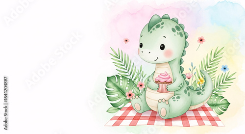 Cute Baby Dinosaur Sitting on Picnic Blanket with Cupcake and Tropical Leaves in Watercolor Style on White Background
