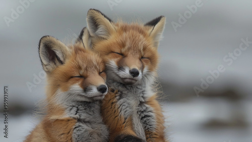 Cute baby foxes cuddling together in a natural habitat, close-up