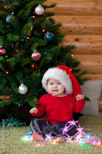 Cute baby Santa near New Year tree