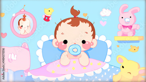 cute baby, sleep, dream, sweetly, cartoon, infant, bedside, manga, illustration, painting, sweet, happiness, blue, pink, healing, bed, sleeping, cute, baby, anime, children, warm, vector, boy, children, card, birthday, angel, children, love, art, frame, shower, fun, design, birth, nubes, pattern, childhood, toy, newborn, cupid