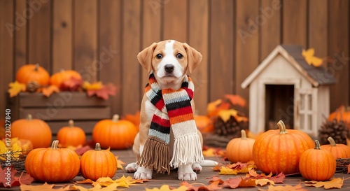 puppy, beagle, dog, autumn, fall, pumpkin, pumpkin, foulard, cute, adorable, animal, pet, canino, seasonal, harvest, orange, leaf, foliage, wooden, background, outdoors, nature, decoration, holiday, celebration, cosy, warm, woolen, striped, sitting, looking, camera, portrait, domestic, mammal, young, small, breed, friendly, happy, joyful, sweet, charming, photograph, image, scene, setting, display, arrangement