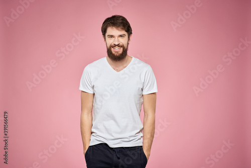 cute bearded men white t-shirt studio pink isolated background