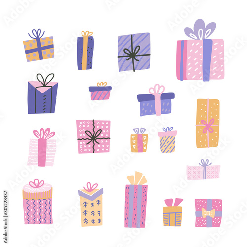 Cute big collection cartoon gift box with hand drawn doodle elements. St of decorated presents with bows and ribbons. Vector scandinavian childish flat illustration.