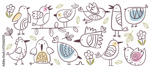 Cute birds singing, sitting, tweeting and flying doodle outline drawing prints vector illustration