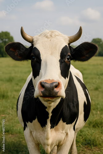 Cute Black and White Cow Smiling in Open Field for Eid al-Adha Celebration