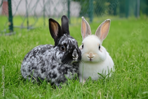 Cute Black and White Rabbits Sitting Together on Fresh Green Grass