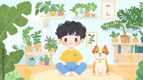 bookshelf, happy, cosy, sitting, indoor, houseplant, rug, potted, boy, carpet, smiling, room, cheerful, interior, green, flower, adorable, design, relaxing, cartoon, comfortable, plant, cute, home, pet, illustration, dog, leaf, puppy, decor, shelf, friends, book