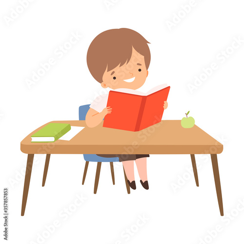 Cute Boy Sitting at the Desk and Reading a Book, Preschool Kid Daily Routine Activity Cartoon Vector Illustration