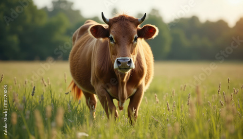 Cute brown cow stands in rich green meadow. Calm sunny day in rural area. Farm animal portrait. Close-up view of cow. Natural landscape. Peaceful scene in countryside. Ideal for agricultural themes.