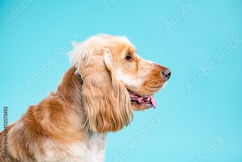 Cute brown English Cocker Spaniel dog on blue background with copy space
