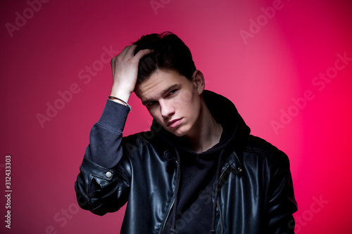man, model, leather jacket, studio, male, pink, background, portrait, young, caucasian, person, guy, photogenic, casual attire, fashion, attractive, adult, boy, black, jacket, face, leather, beautiful, 1, serious, hair, modern, white, sexy, looking, beauty, european, cheerful, elegant, pretty, satisfaction, vogue, clothing, satisfy, glamour, natural, hipster, sassy, stylish, youth, excited, dark, student