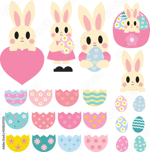 cute bunny easter clipart, pastel rabbit digital art, kawaii bunny with easter egg, adorable bunny holding heart, baby rabbit in egg shell, spring bunny illustration