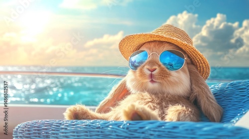 Cute bunny in straw hat and sunglasses relaxing on a chair by the ocean. Funny animal enjoying sun and summer vacation. Generative ai cartoon character concept.