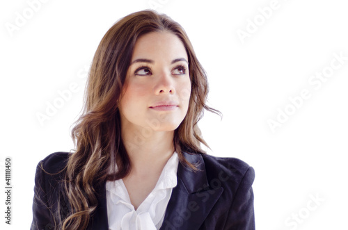 young, beautiful, woman, cute, girl, pretty, female, white, background, copy, space, isolated, business, success, marketing, looking, up, right, idea