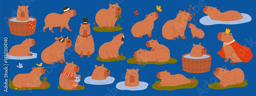 capybara, cute, animal, vector, illustration, set, water, sticker, hat, bird, funny, hot drink, bathe, hot, barrel, character, isolated, duck pond, river, sleep, grass, rodent, butterfly, sunglasses, foulard, snob, baby, design, monocle, childish, tropical, lazy, eating, nature, rainforest, life, crown, drink, king, gentleman, hand-drawn, mammal