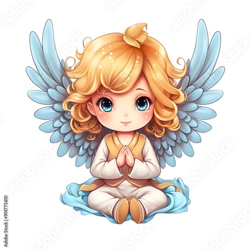 angel, cartoon, cute, wing, blonde hair, praying, meditation, adorable, sweet, gentle, expression, sitting, peaceful, spiritual, faith, hope, love, innocence, purity, divine, heavenly, celestial, cherub, guardian angel, religious, prayer, hand, clasped, smile, white background, illustration, digital artwork, fantasy, anime, manga, art, graphic design, graphic art, artwork