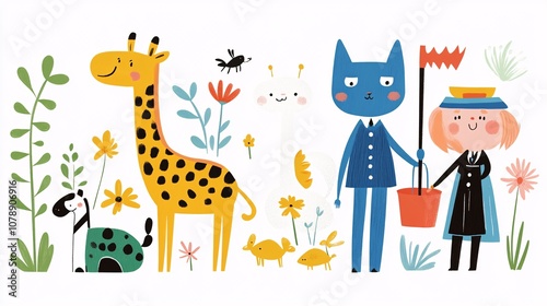 art, animal, design, cute, book, plant, flower, girl, giraffe, children, print, childcare center, yellow, animal, card, children, cat, cover, happy, friends, green, cartoon, digital, colourful, illustration, greeting, flag, bucket, blue, children, element, whimsical, poster, funny