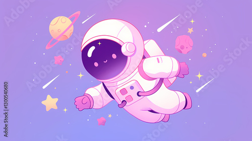 Cute cartoon astronaut floating in space with planets, stars, and comets in a colorful background