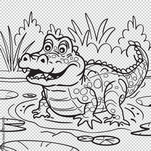 Cute cartoon baby alligator design for kids coloring book, black vector illustration on transparent background