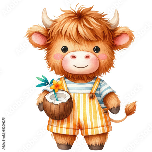 cow, character, drink, cartoon, coconut, highland, children, design, wear, stripes, lovely, playful, outfit, summer, overall, funny, yellow, friendly, furry, lively, nature, vacation, cheerful, theme, whimsical, costume, joyful, honed, charming, graphic, mascot, clothing, colourful, cartoony, sunny, happy, tropical