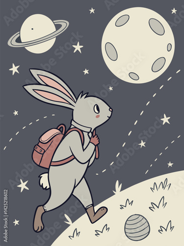 Cute Cartoon Bunny Hiking Under the Moon and Stars with Backpack, Whimsical Illustration, Space Theme, Easter Egg