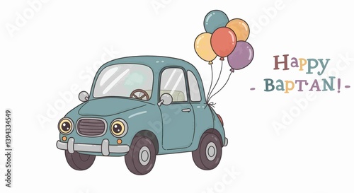 Cute cartoon car with balloons celebrating a special event, festive occasion.