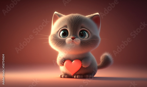 Cute Cartoon Cat Holding a Red Heart. Generative AI